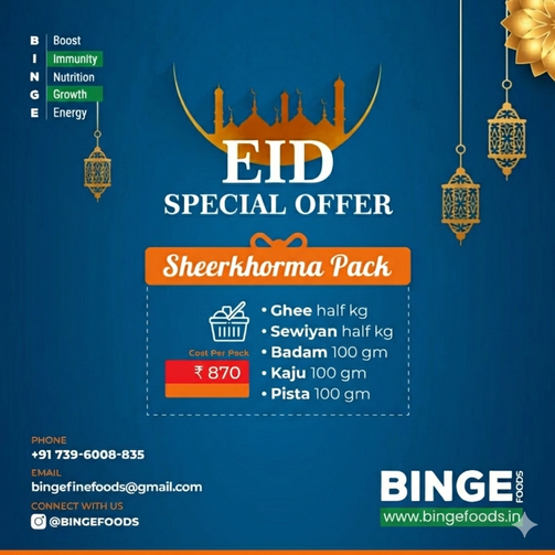 Eid Sheerkorma Pack consists of all the best & essential items needed to make the traditional Hyderabadi Sheerkorma. The Sheerkorma Pack by Binge Foods has Ghee Almonds Cashews Pistachios and most importantly Sewiyan. Binge on Sheerkorma this festive season.